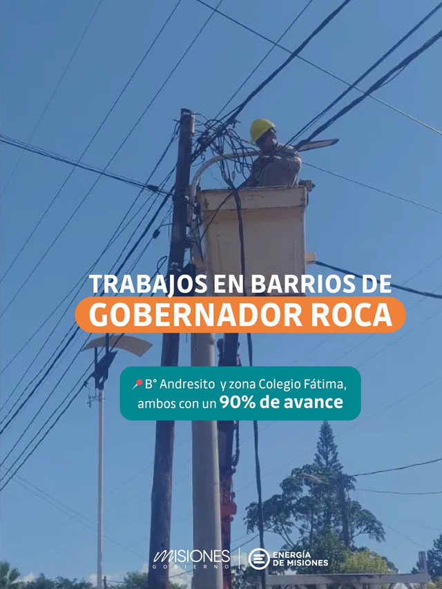 AGENCIA MISIONES.UNO | Energía de Misiones informó que los trabajos de mantenimiento y modernización de la red eléctrica en Gobernador Roca ya alcanzan un 90% de avance, con intervenciones en el barrio Andresito y la zona del Colegio Fátima.