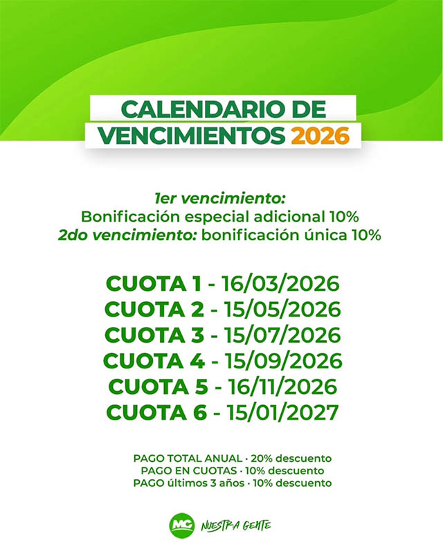 Desde el Municipio informaron que el calendario incluye distintos vencimientos a lo largo del año, manteniéndose los incentivos para quienes abonen dentro de los plazos establecidos. El primer y segundo vencimiento cuentan con una bonificación especial del 10 por ciento.